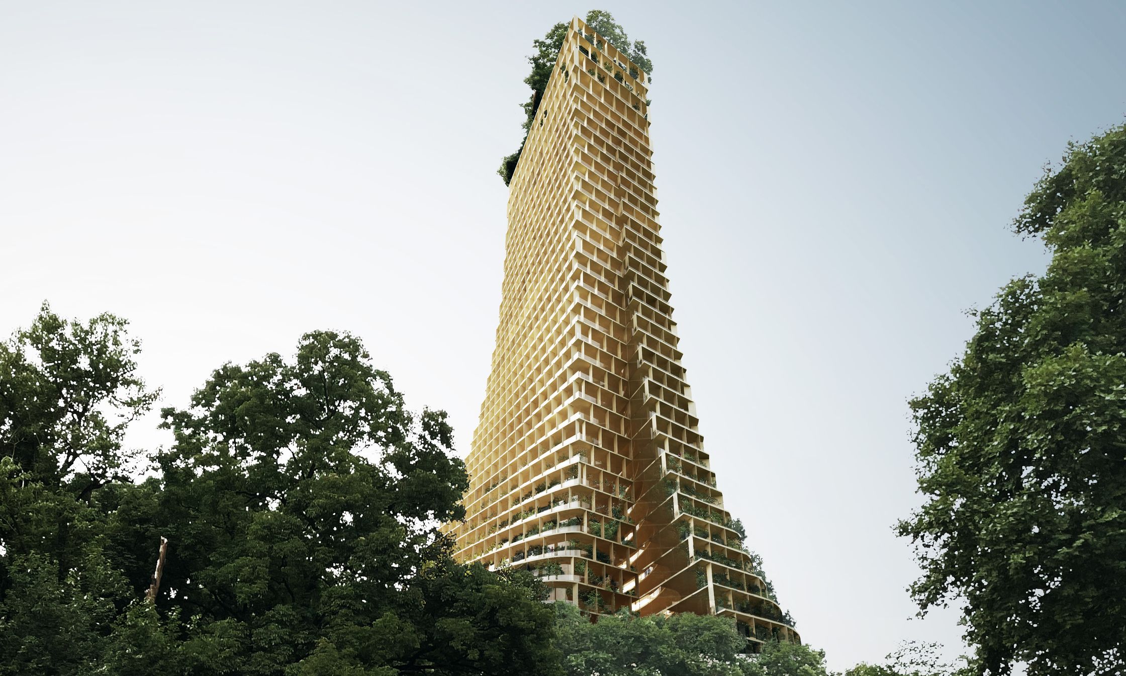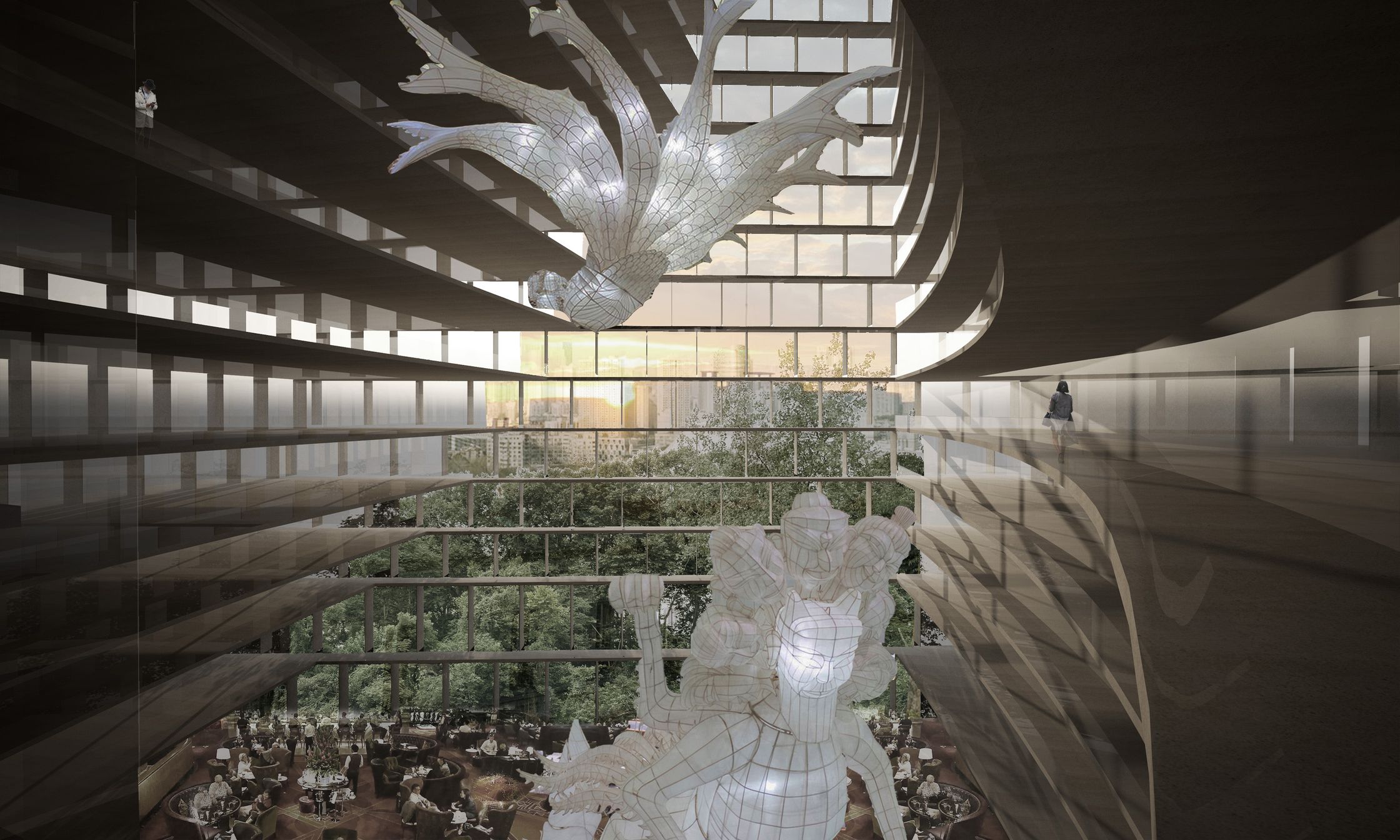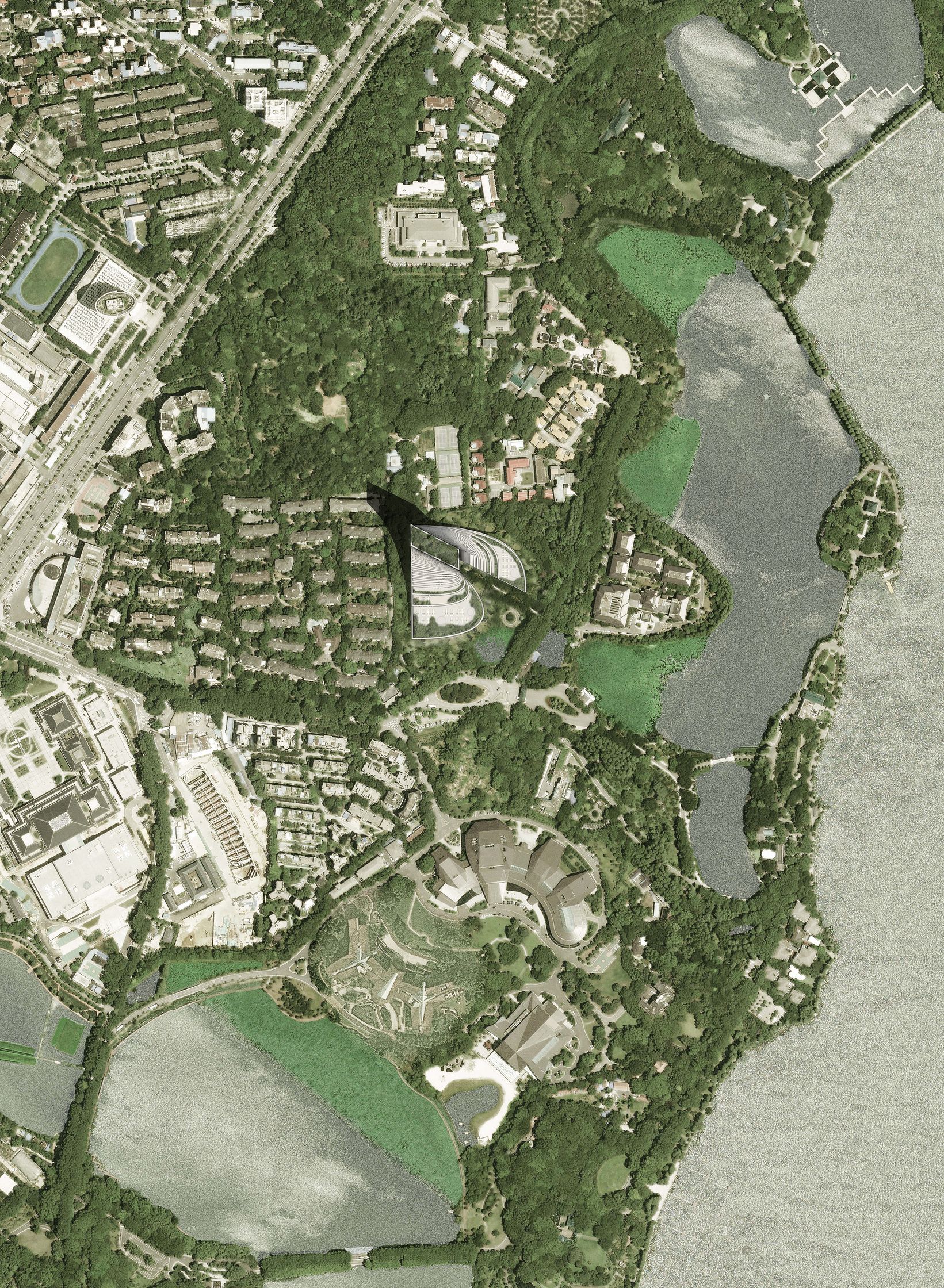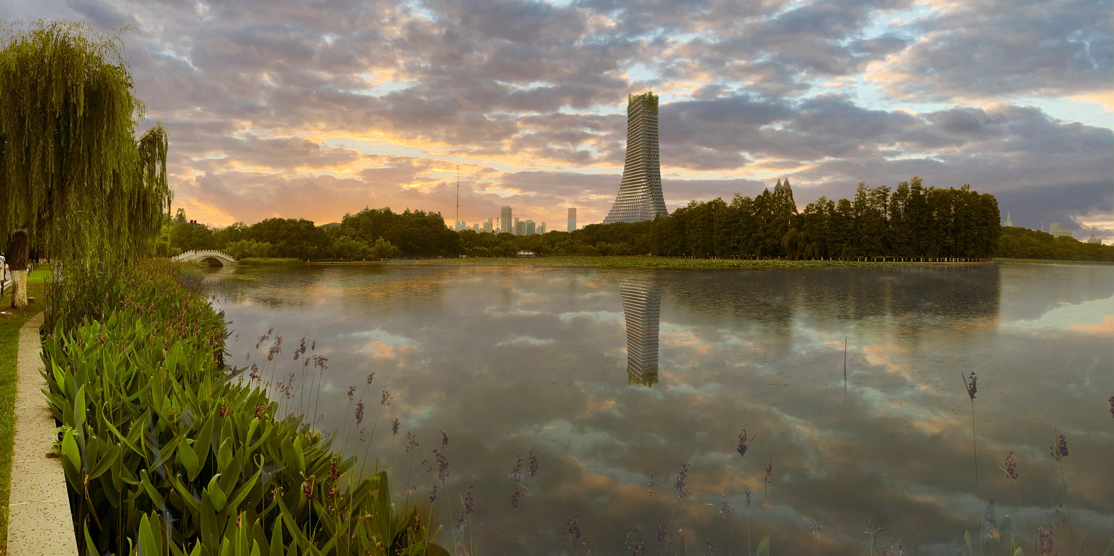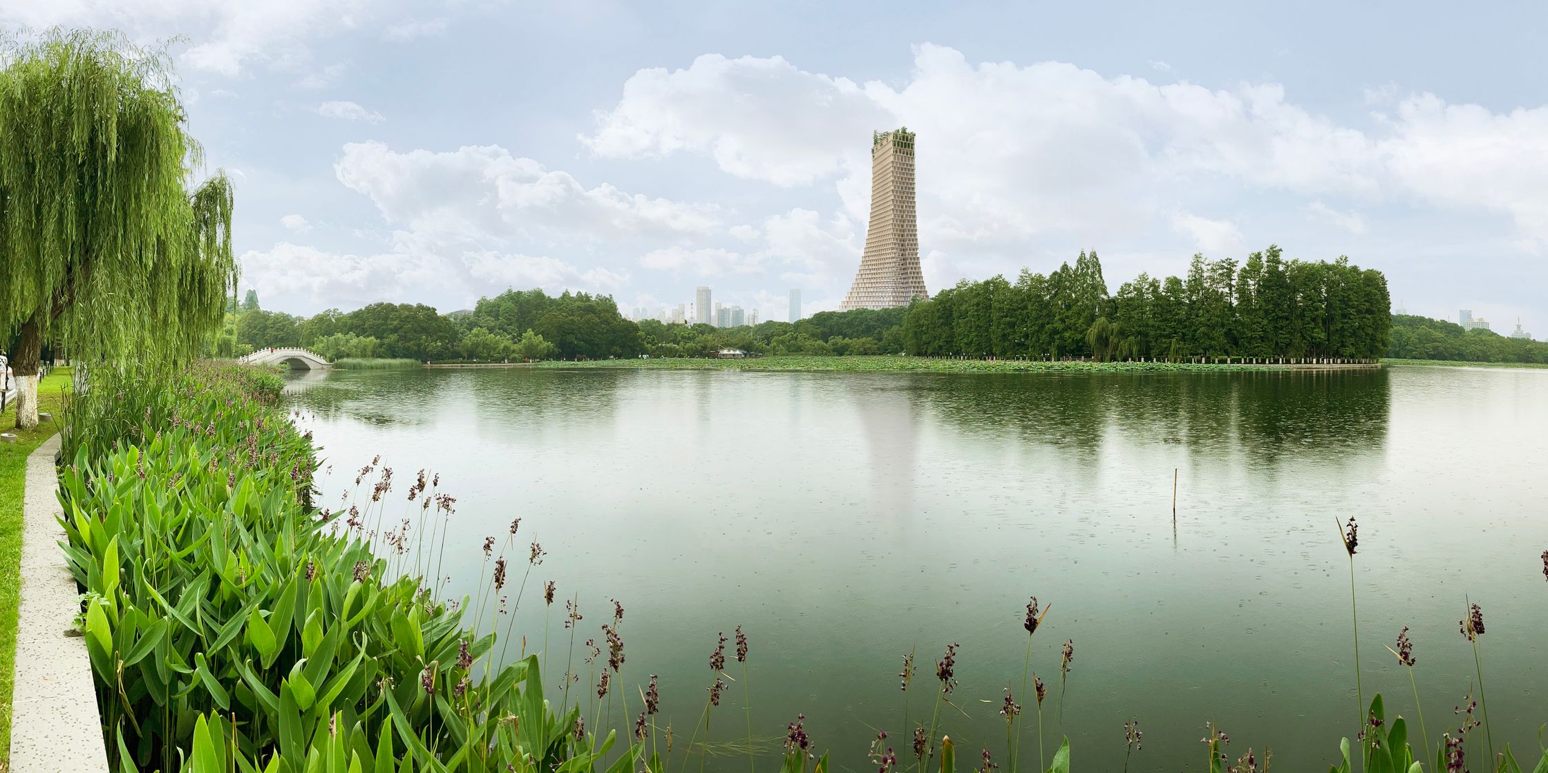 The Pinnacle rises from amongst the trees along Wuhan's historic East Lake, recalling the mountains on the horizon, clad in their green cloaks.