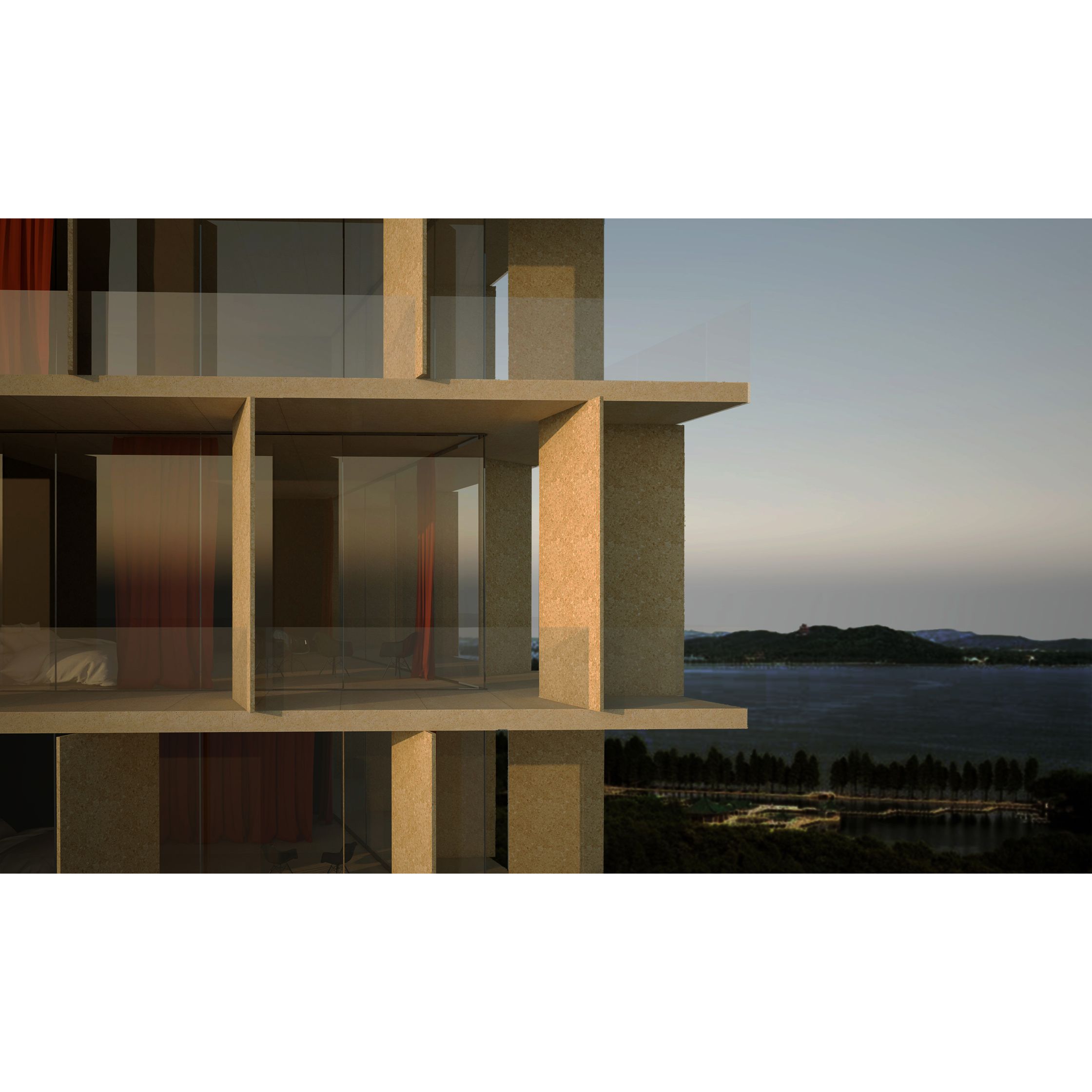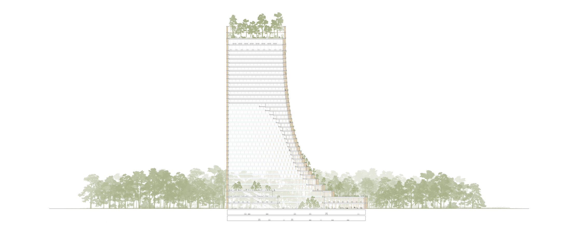 The spire twists to offer views of the water from all the hotel rooms and rooftop gardens, and widens at its base for a congress centre with a vertical atrium and reception halls on several levels.
